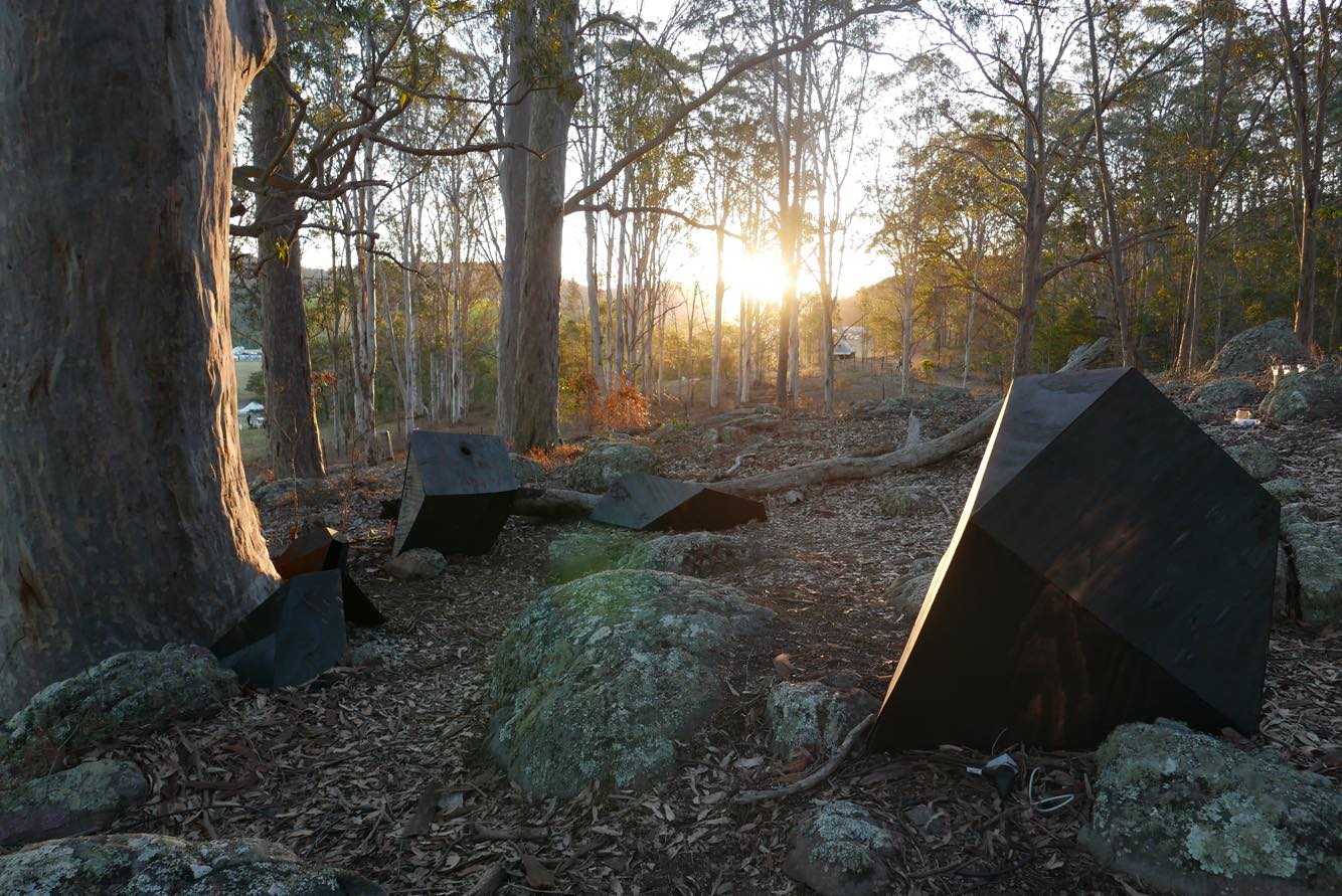 The day of the installation. Carting our giant charred plywood structures, we got to work composing them in the tranquil setting. It struck us immediately how well-suited our installation was to its environment. Dotted with charred tree trunks, twisting gums, a scattering of decaying leaf-litter and ancient lichen covered stones, we nestled the structures into the landscape itself.